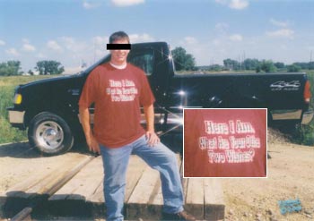 This guy wants to be remembered for his truck and his sense of humor. Just in case you can't read it, his T-shirt says: "Here I Am, What Are Your Other Two Wishes?"